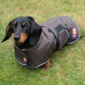 The Thermal Quilted Dachshund Coat from Ginger Ted is a high quality, super warm coat designed to keep your dog extra warm and clean. Made from a quilted durable fabric with a thermal insulating filling and lined with a fleecy fur fabric. The coat features an adjustable overlap front and a body/belly strap together with reflective piping and a fold down neck. The coat also has a small zipped slot for use with a body/shoulder harness.