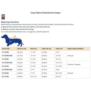 Our Dachshund fleeces are sized according to your dogs size rather than the jumper itself. Please see our Size Guide within the product images for measuring instructions.