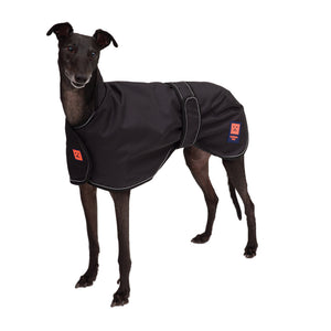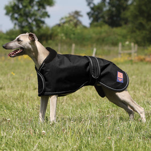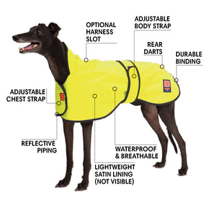 Our waterproof lightweight Greyhound coat is a super light all-round comfortable coat designed to keep your dog dry, warm and clean. Ideal for wet conditions when it the weather is not too cold. Made from a coated polyester outer fabric which is waterproof, windproof, breathable and washable. The coat is lined with a soft satin lining and features adjustable front and body/belly straps together with reflective piping. Other features include a fold-back high-neck wither flap and a collar lead slot.