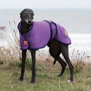 Bamboo Greyhound Drying Coat designed to dry and clean your dog quickly after a muddy wet walk, bath or hydrotherapy. The coat is designed to fit the majority of Sighthounds such as Greyhounds, Whippets, Lurchers, Salukis and similar cross breeds. The bamboo mix fabric is ultra absorbent, breathable and quick drying. Bamboo itself is a natural fibre both anti-microbial and hypo-allergenic. Bamboo has many advantages over traditional cotton with a softer feel, natural UV protection and more eco-friendly.