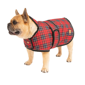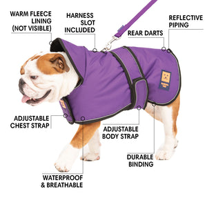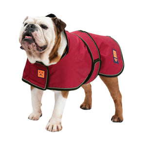 Our waterproof Bulldog coat is a superb all-round comfortable coat designed to keep your dog dry, warm and clean. Made from a coated polyester outer fabric which is waterproof, windproof, breathable and washable. The coat is lined with warm fleece and features adjustable front, harness slot and body/belly straps together with reflective piping. Other features include a fold-back high-neck wither flap and lead slot. The coat is designed to fit Bulldogs, Frenchies, Bull Terriers and other medium sized barrel chested breeds.